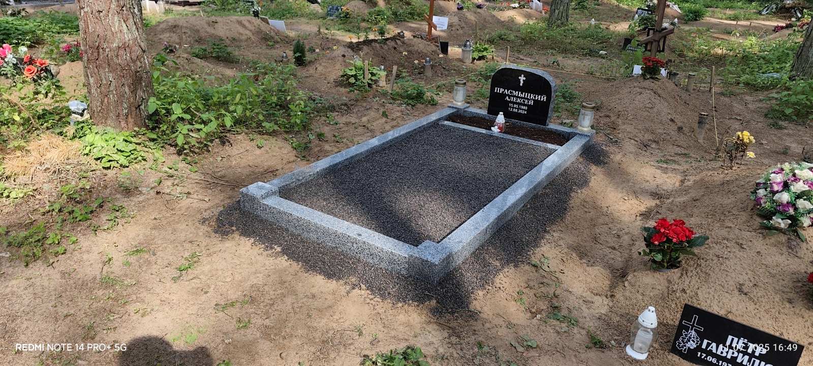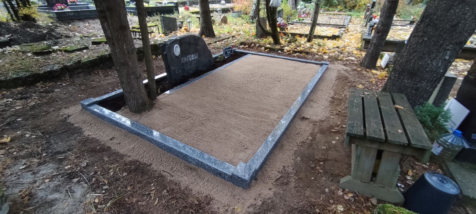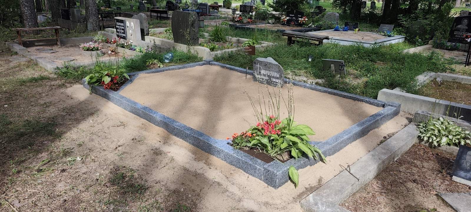 В стоимость входит: армированный фундамент, цельные гранитные блоки, отделение для цветов, засыпка садовой землей, геотекстиль, песок.